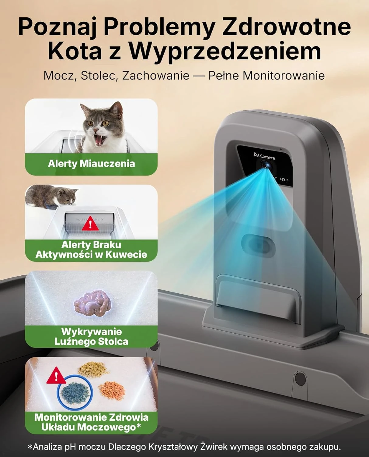 Zapomnij o codziennym obowiązku sprzątania i zyskaj pełną kontrolę nad zdrowiem swojego kota. PetKit Purobot Crystal Duo to nie tylko automatyczna toaleta, ale prawdziwe centrum diagnostyczne dla Twojego pupila. Dzięki otwartej konstrukcji z niskim wejściem (zaledwie 18 cm) jest idealna dla kotów dużych ras oraz seniorów. Wbudowana kamera AI, mikrofon oraz system analizy pH żwirku pozwalają na bieżąco monitorować nawyki zwierzaka i błyskawicznie reagować na pierwsze objawy problemów zdrowotnych (np. z układem moczowym).