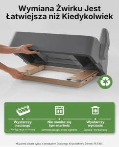 A: Absolutnie nie! Ten model (Crystal Duo) jest zaprojektowany wyłącznie pod niezbrylający żwirek silikonowy/krzemionkowy. Bentonit lub żwirek drewniany zablokują mechanizm grabiący i zniszczą urządzenie.
