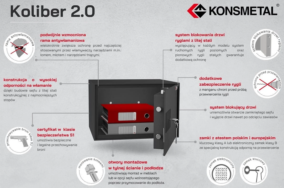 Koliber 2.0 przeszedł odpowiednie rygorystyczne, niezależne testy. Poradzi sobie ze złodziejem „wewnętrznym”, czyli osobami odwiedzającymi Twój dom (ekipa remontowa, sprzątaczka, kurier etc.), złodziejem „nieprzygotowanym”, tj. bez specjalistycznych narzędzi a dzięki wzmocnionej ramie antywłamaniowej jest również znakomitą ochroną przed złodziejem lepiej „przygotowanym”, wyposażonym np. w łom. Trzymając wszystkie ważne przedmioty i dokumenty w sejfie z łatwością utrzymasz porządek i zabezpieczysz je także przed dziećmi, zwierzętami domowymi, przypadkowym zniszczeniem czy zgubieniem.