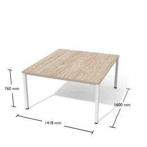 Stół na stelażu metalowym. Nogi o przekroju kwadratowym wyposażone w stopki umożliwiające wypoziomowanie mebla.